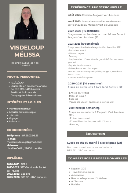 Je ne souhaite pas continuer les études et préfère me lancer dans la vie active. Je souhaiterais continuer à travailler dans le domaine des plantes et plus particulièrement les plantes d’intérieur. En ayant pu effectuer plusieurs semaines de stage dans ce rayon j’ai découvert une passion pour ces plantes et j’aimerais pouvoir continuer à en apprendre d’avantages et en découvrir de nouvelles.