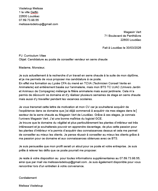 J’ai postuler au poste de responsable serre chaude début avril car ma maître de stage m’a annoncé qu’elle changeait de métier fin mai.