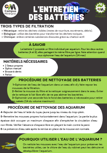 • Le bon entretien des systèmes de filtration et des batteries, est essentiel pour garantir la qualité de l’eau, le bien-être des animaux aquatiques et la prévention des maladies. Vous devez rédiger une procédure claire, précise et applicable, pour les élèves amenés à effectuer cette tâche.